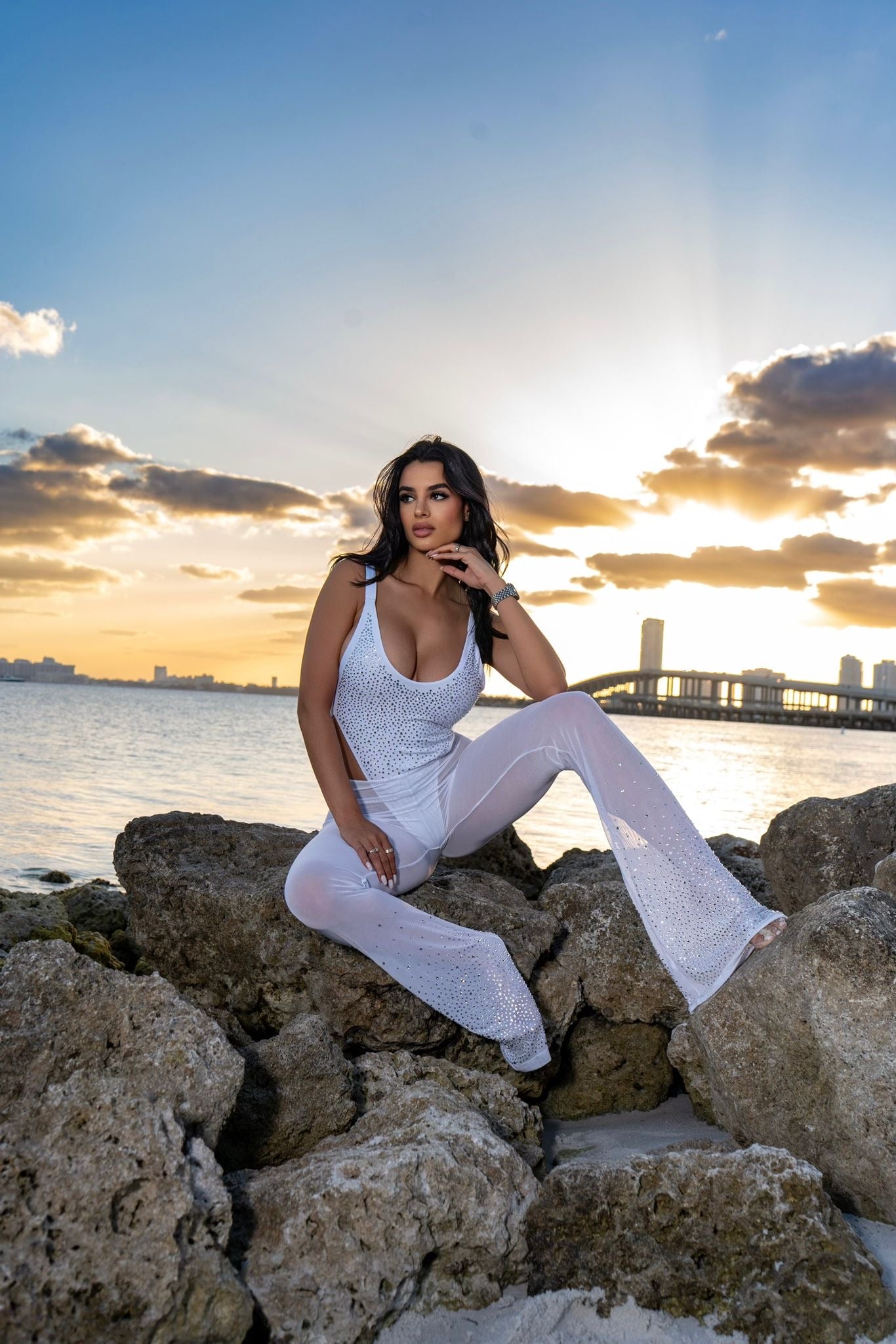 Our unique plunging scrunch back sheer mesh white pant with clear crystals is the perfect cover up piece to compliment all your pink melon swimwear.